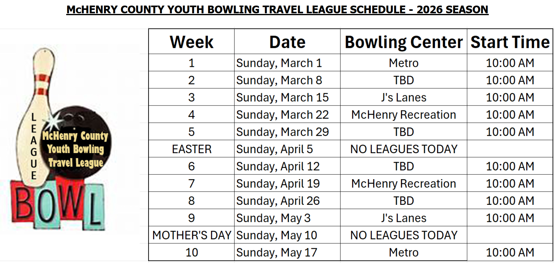 • The NEW! McHenry County Youth Bowling Travel League (MCYBTL) will bowl three games on SUNDAYS.